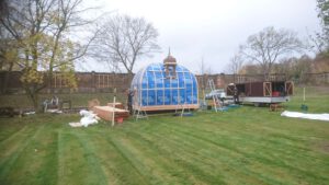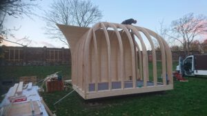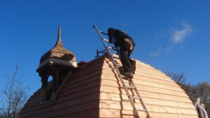 Die Grundkonstruktion aus geschweiften Spanten steht auf einer Bodenplatte, die auf temporären Fundamenten verankert ist. Schuppenförmig aufgebrachte Lärchenbretter bilden die Außenhaut. Unser Bauherr hatte zwei Türmchen gesammelt, die nun als Gauben in den Dachbereich eingebaut, für die Belichtung des Innenraums sorgen