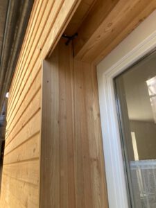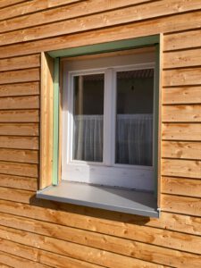Unsere Bauherren wollten sich möglichst schnell von der alten Eternit-Verkleidung am Giebel ihres Wohnhauses trennen. Gleichzeitig sollten der Giebel und die beiden Traufwände zum Nachbarn der Doppelhaushälfte energetisch saniert werden, auf einen U-Wert von 0,14 W/m²K. Dies wurde erreicht durch ein vorgesetztes Riegelwerk, verkleidet mit Holzweichfaserplatten und ausgedämmt mit Zellulose-Einblasdämmung. Das Haus ist verkleidet mit Keilnutschalung aus sägerauer Lärche, befestigt mit Edelstahl-Schrauben. Die Lage der neuen Fenster wurde so gewählt, dass die dazugehörigen Rollladenkästen hinter der Holzfassade eingebaut werden konnten und sich somit nicht in der Fassade abzeichnen